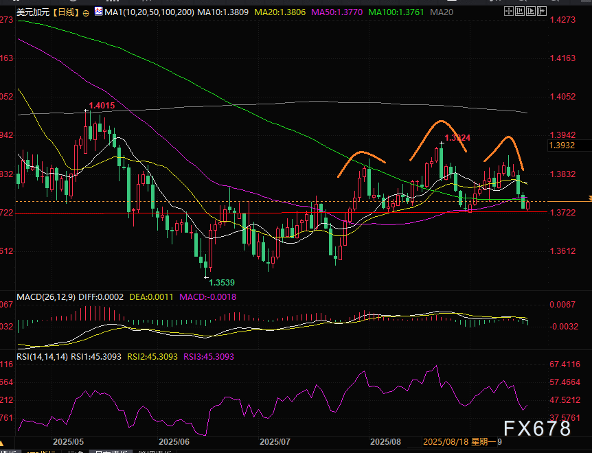 美元兑加元当前处于中性震荡区间,8月以来始终在1.39阻力位下方整理。市场疑似正在构建头肩顶形态,但需价格明确跌破1.3720确认形态成立——一旦破位,将打开下行空间,目标指向2025年低点1.3650及1.3540区间