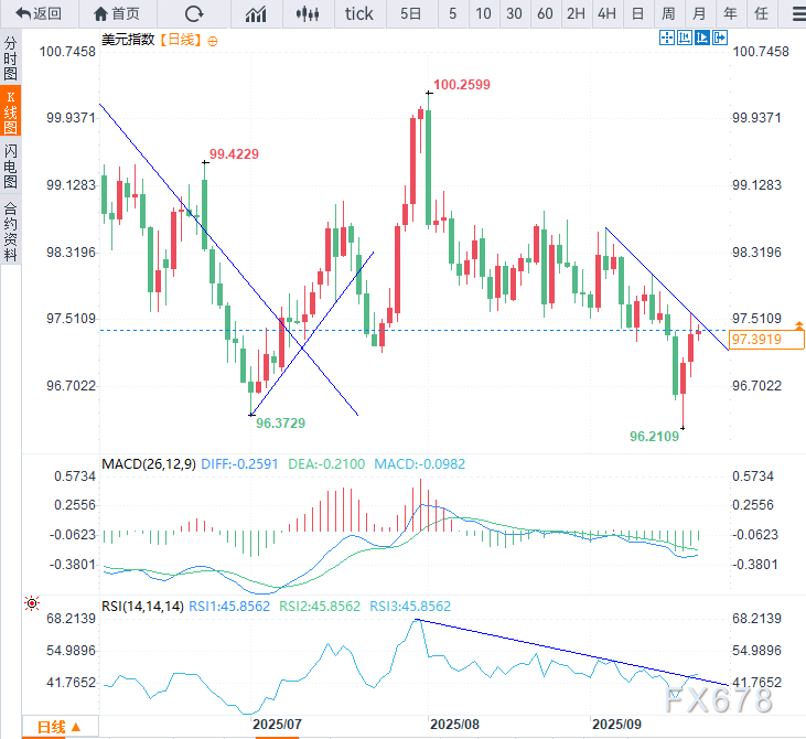 从日线图看,美联储会议后周三(9月17日)形成的“穿刺形态”是经典反转信号——该形态以跳空低开创出新低,却在后续交易时段强势逆转。周四的跟进买盘强化了这一信号,价格目前正试探短期下行趋势阻力位(97.50附近)。