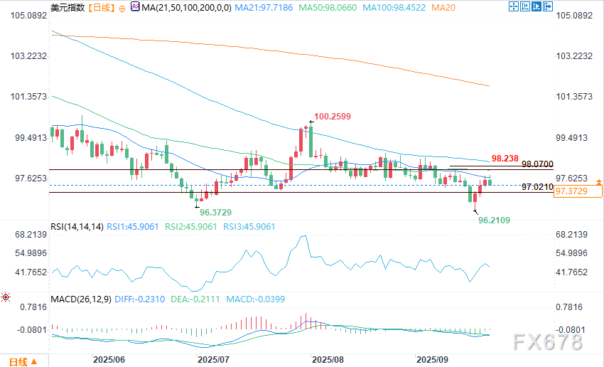 美元指数正测试关键技术水平,可能形成看跌收盘反转顶形态。若该形态得到确认,可能引发指数回调至50%支撑位97.021。上行方面,50日平均线98.070及枢轴阻力位98.238构成强劲阻力。