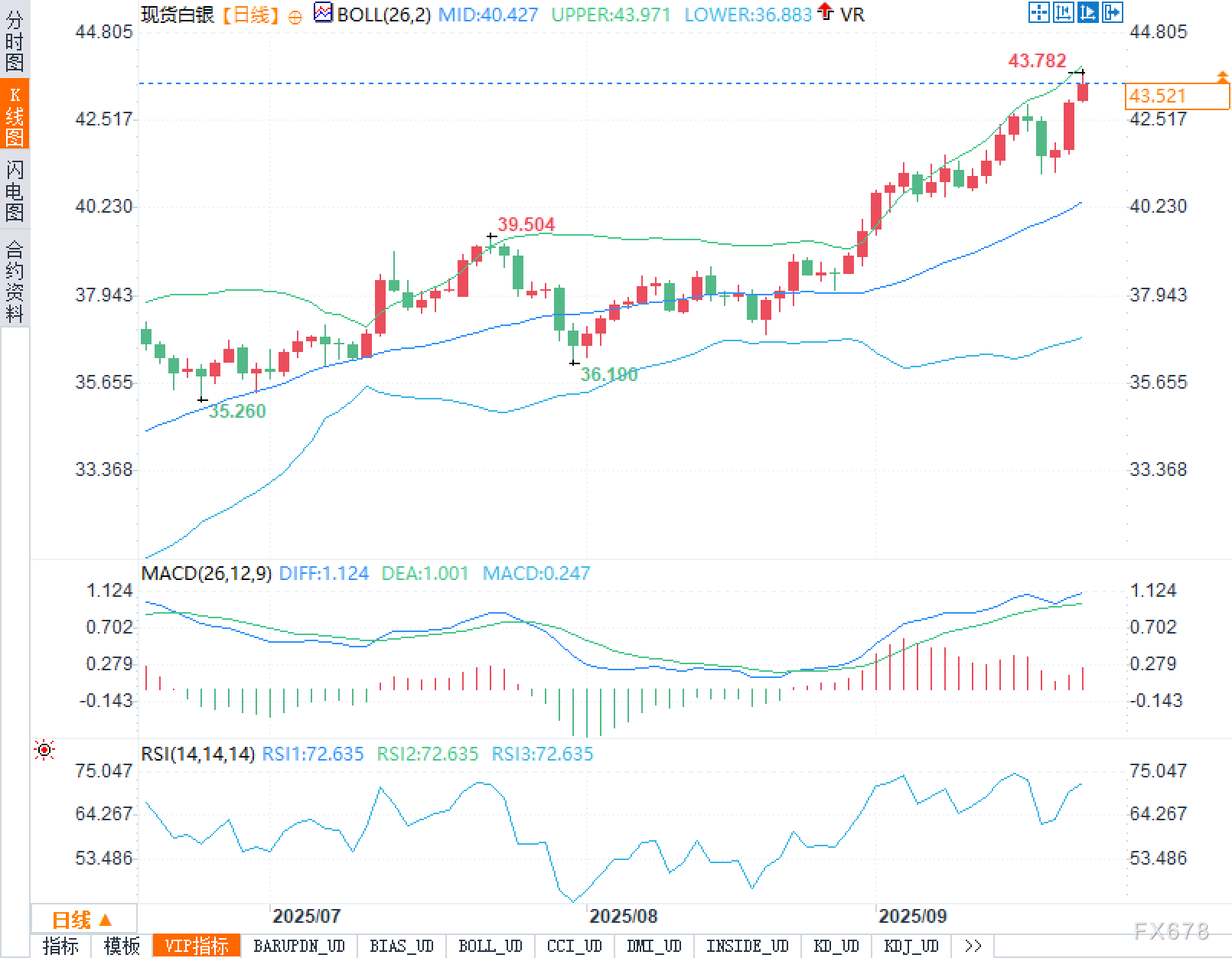 周一(9月22日)北美时段,现货白银围绕43.5美元/盎司高位震荡,盘中延续上周的强势,距高点43.782美元/盎司仅一步之遥,刷新“14年新高”的背景下,多空进入敏感博弈区。与之相呼应的是,10年期美债收益率三连升后在4.15%上方续涨乏力;上周三联邦公开市场委员会(FOMC)将联邦基金利率下调25个基点至4.00%-4.25%,并通过点阵图暗示年末利率或指向3.6%。美元指数(DXY)徘徊在97.50附近,曲线整体偏软,为包括白银在内的贵金属提供边际支撑。