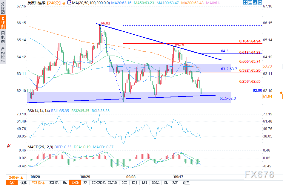 上方阻力位首先是0.382斐波那契回调位63.20,其次是MA100所在的63.5附近,以及更高的0.500回调位63.74和下降趋势线附近。价格若要反弹,需要突破这些阻力位,否则仍会受到压制继续下跌。