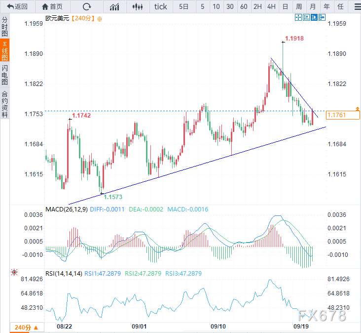 欧元/美元周一(9月22日)延续上周疲软态势,继续从上周三创下的1.1918长期高点回落,欧市时段汇价于1.1750附近震荡盘整,美元指数持稳。今日稍晚仅有一系列美联储官员讲话日程,或将提供基本面指引。