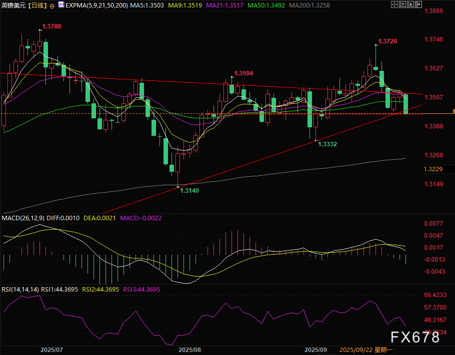 周三欧美交易时段,英镑兑美元汇率下探至1.3445附近。一方面,9月英国商业活动数据不及预期并且连同英国央行释放鸽派信息直接压制英镑走势;另一方面,美联储主席杰罗姆·鲍威尔周二讲话中重申对进一步放宽货币政策的谨慎立场,推动美元反弹回升至97.81(+0.62%)附近,共同打压英镑走势。但英镑快速下跌至关键价位,预示着未来走势可能的变化。