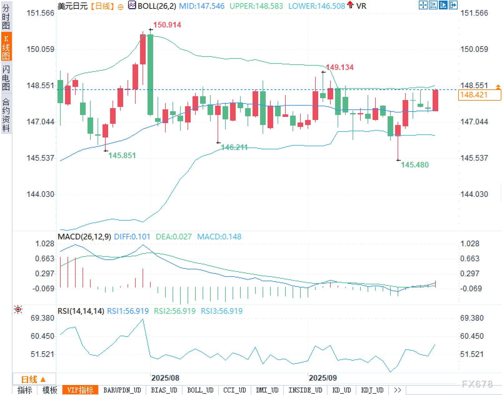 从日线图看,布林带中轨147.546,上轨148.583,下轨146.508。最新价148.421已逼近上轨,显示短线动能占优但上方空间开始受带宽约束。前期摆动高点149.134与更早的150.914构成静态阻力阶梯,而近端低点146.211/145.480与更早的145.851形成层层支撑。