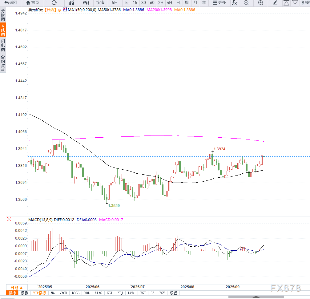 反之,若能重新站稳1.3950阻力位上方,则可能再度冲击1.4000整数关口。整体来看,技术面显示行情处于高位整理阶段,短线或受基本面数据驱动突破区间。