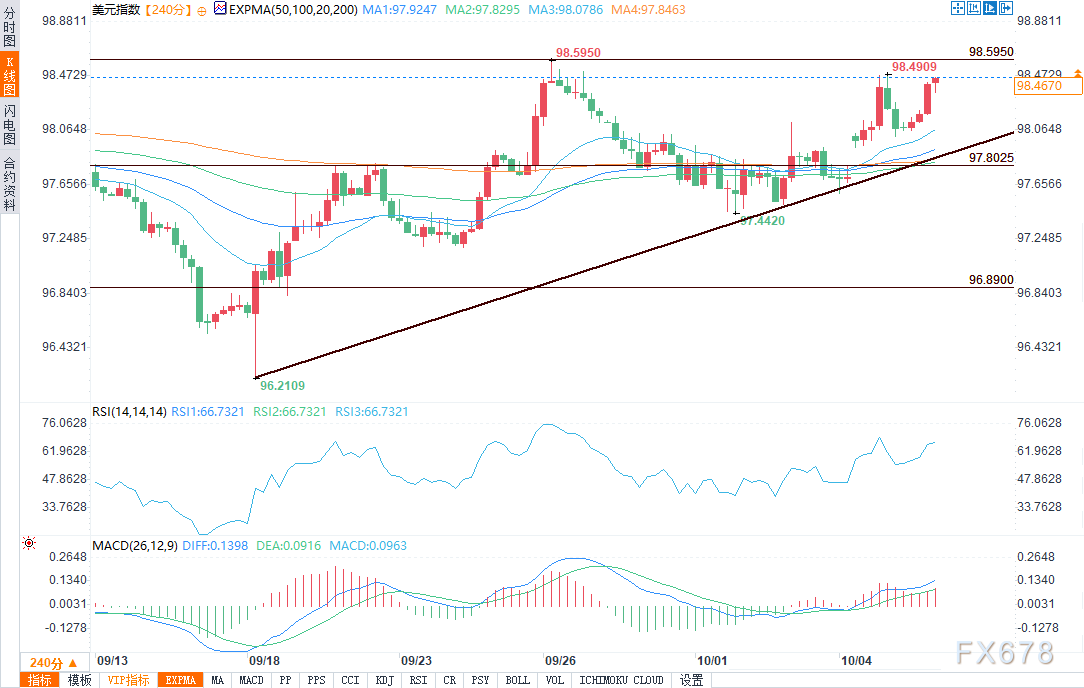 周二(10月7日)欧洲交易时段,美元指数(DXY)连续第二个交易日延续涨势,在98.43附近波动。