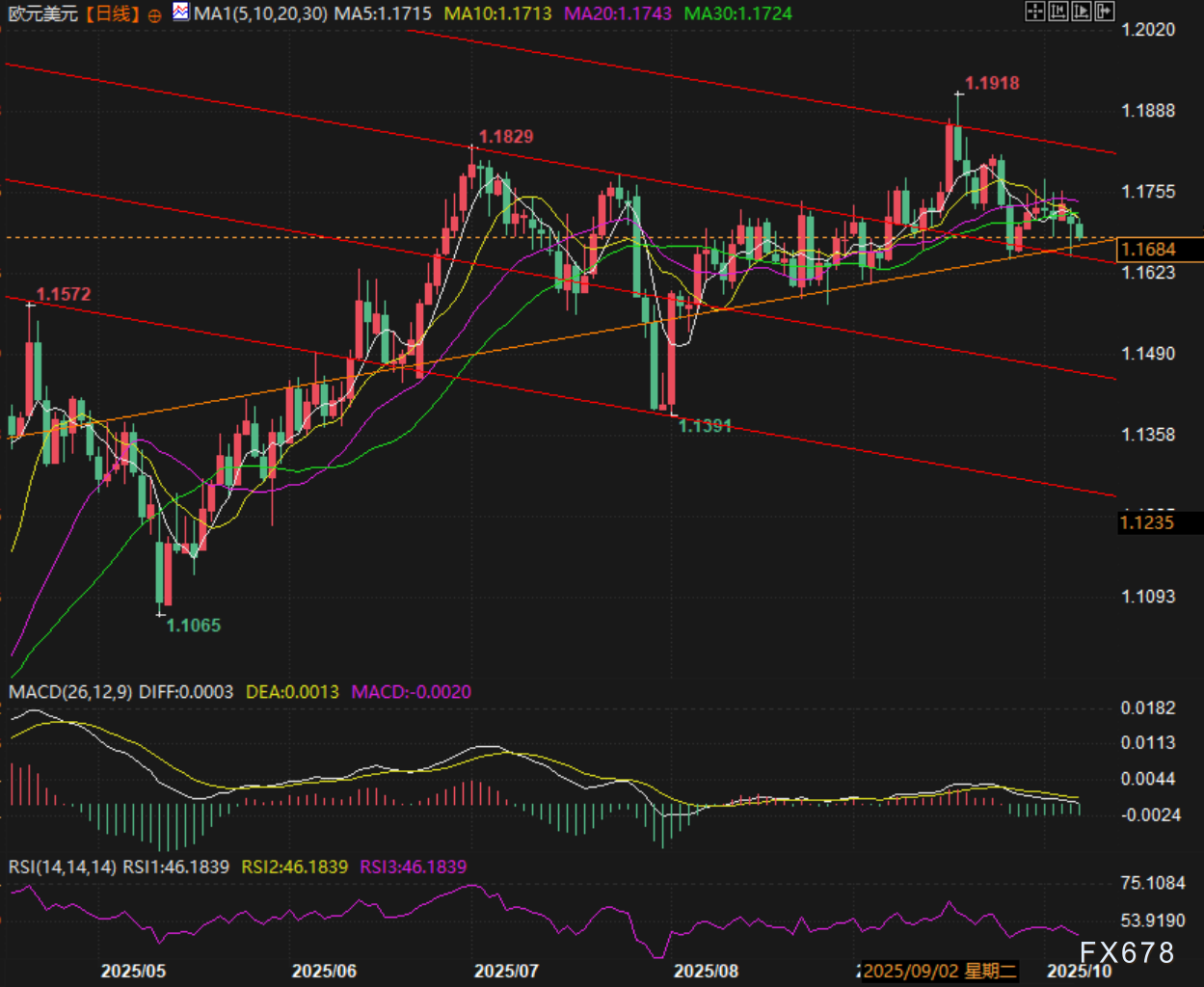 周二(10月7日)亚欧时段欧元兑美元继续走弱,目前跌0.25%,交投于1.1677附近,市场深陷高度疑虑氛围,昨日公布的经济数据没有明显好转,欧盟地缘政治局势持续承压,其中法国政局动荡始终是核心关切议题。