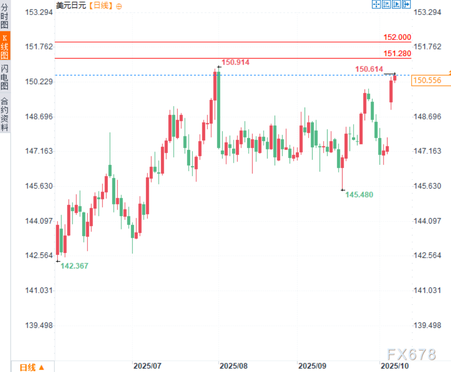 —周二(10月7日),美元/日元延续涨势,一度达150.61的两个月高点。因东京政治变动导致日元大幅抛售。有报道称支持经济刺激的候选人和日本央行加息的公开批评者高市早苗有望成为日本首位女首相,市场对此作出反应,引发日元普遍下跌,并重新激发对利差交易的兴趣。