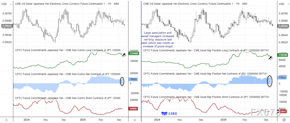 最新发布的交易员持仓报告显示,提前布局的多头遭遇了意外打击。截至周二,大型投机者与资产管理机构的净多头头寸当周合计增加2.56万手。其中新增多头仓位占据主导:大型投机者的日元多头总持仓增长9%,资产管理机构增长8%,合计新增2.25万手多头合约。大型投机者同时还削减了3.5%的空头总持仓(减少3600手)。