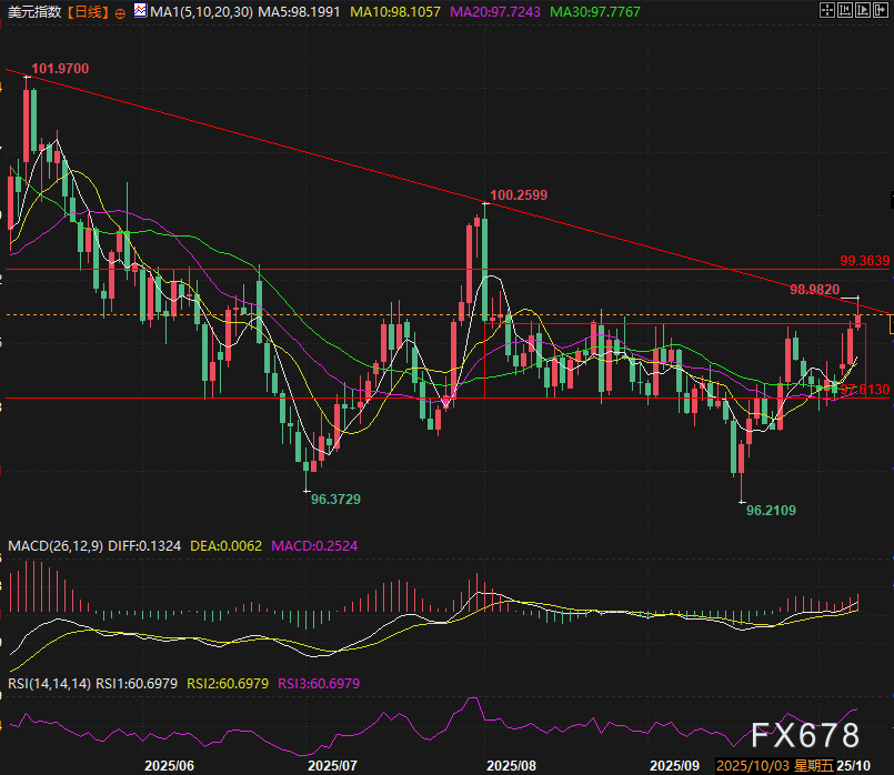 周三欧洲时段美元指数走出冲高回落走势一度涨至98.98,同时突破了为期两个月的整理平台,目前涨幅收窄至0.20%。过去几个交易日,美元对政府停摆相关风险表现出显著的抗跌韧性。我们将此归因于两重核心因素的叠加:其一,市场普遍预期联邦政府停摆对经济的实质冲击将处于可控区间;其二,其他区域的政治动态正分流市场对美国国会内部博弈的关注焦点。