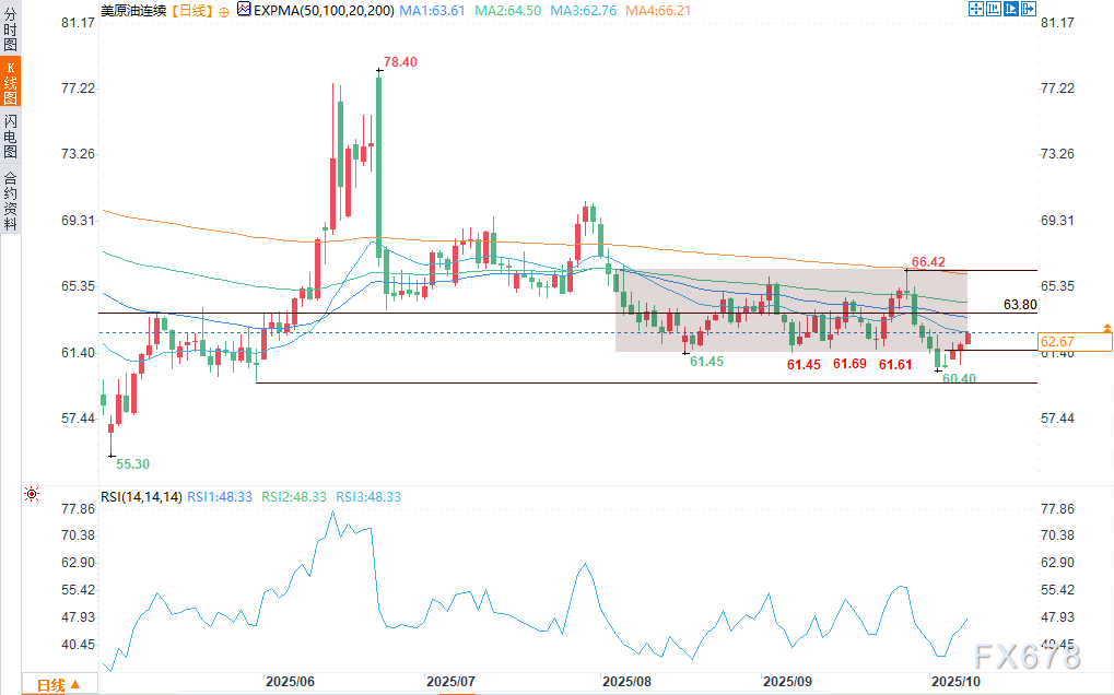 周三(10月8日),WTI原油期货连续第四个交易日延续反弹态势,从60.40美元至59.91美元的关键支撑区间回升。此次反弹使西德克萨斯中质原油逼近20日移动平均线(62.76美元)。