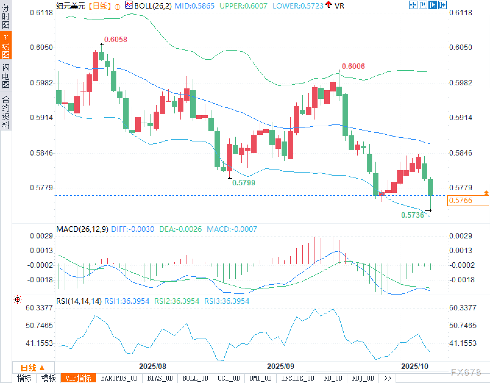 日线图显示,汇价现运行于布林带下轨附近,具体参数为中轨0.5865、上轨0.6007、下轨0.5723。价格多次在下轨上方窄幅震荡,体现出布林带挤压后的下沿贴线特征,短线趋势仍处于下降趋势主导。近期两个关键枢轴:0.5800(前一波反弹高点附近的回测位)与0.5736(最近一次刺破后的低点)。上方存量阻力依序为0.5865(布林中轨)→0.6006→0.6058,均对应前期K线图高点或轨道位,构成多重阻力位叠加。