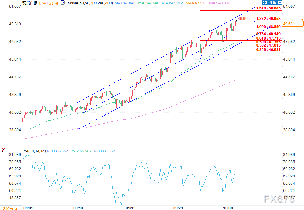 周四(10月9日)欧盘时段,白银价格在当日先波动震荡随后大幅上扬。尽管美元表现强劲,贵金属整体交投仍偏强。现货白银价格盘中报49.635美元/盎司,涨幅1.62%,离50.00美元的心理关口越来越近。