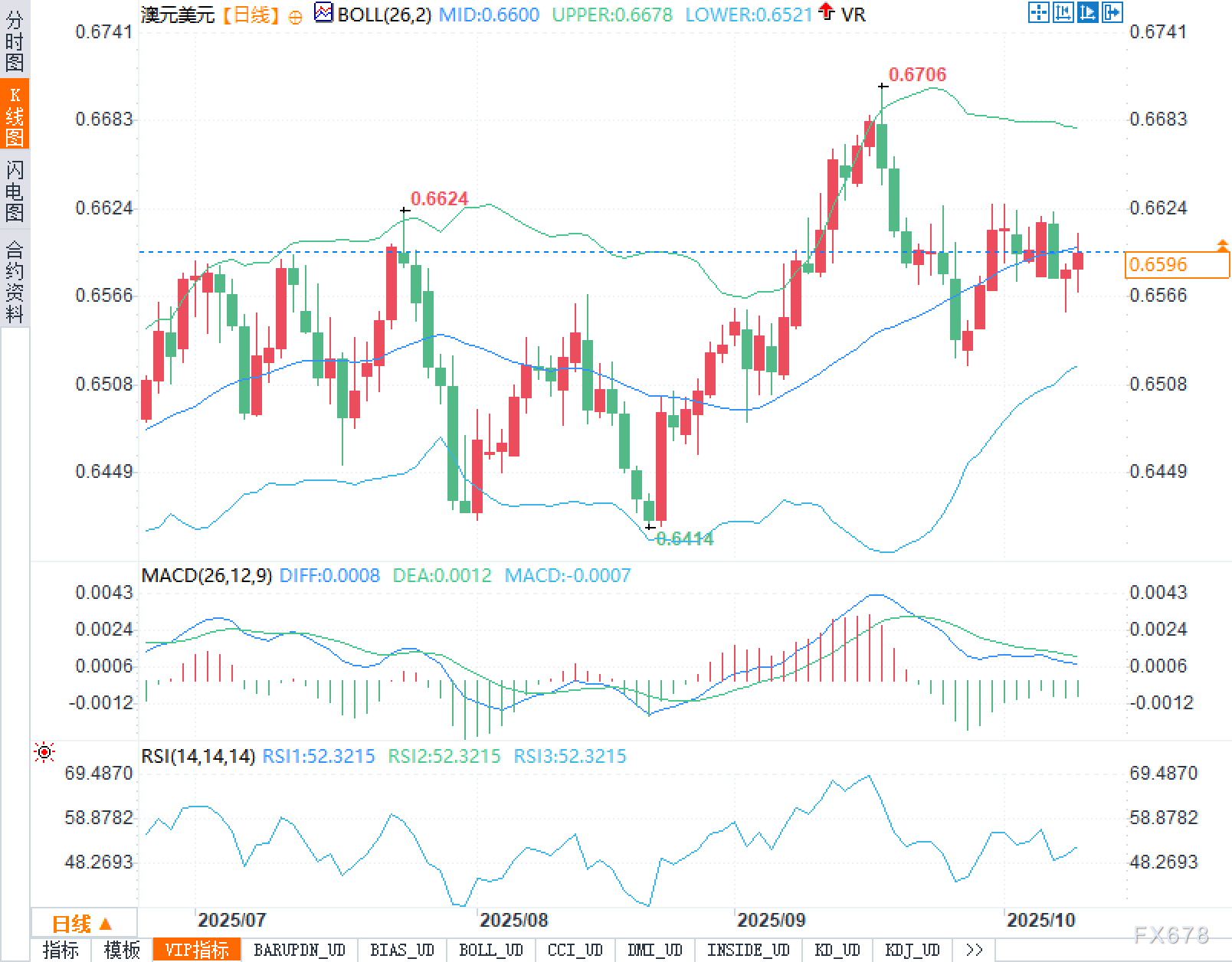 日线图显示,布林带中轨位于0.6600、上轨0.6678、下轨0.6521;汇价现基本贴近中轨,属于“中轨压舱的均值回归态”。从波动结构看,8—9月的上行段在0.6706形成阶段峰值,随后出现三连阴与两次反弹未果的“回撤—再测中轨”组合,期间曾在0.6624附近打出低位的下影信号,但未能转化为有效突破。