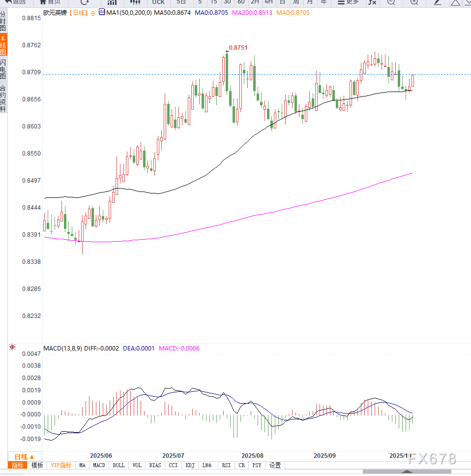 从日线图来看,EUR/GBP连续两日收阳,短期技术结构改善。价格站稳于5日与10日均线上方,显示买盘力量增强。RSI指标向上突破50中轴,MACD红柱持续放大,表明动能偏多。
