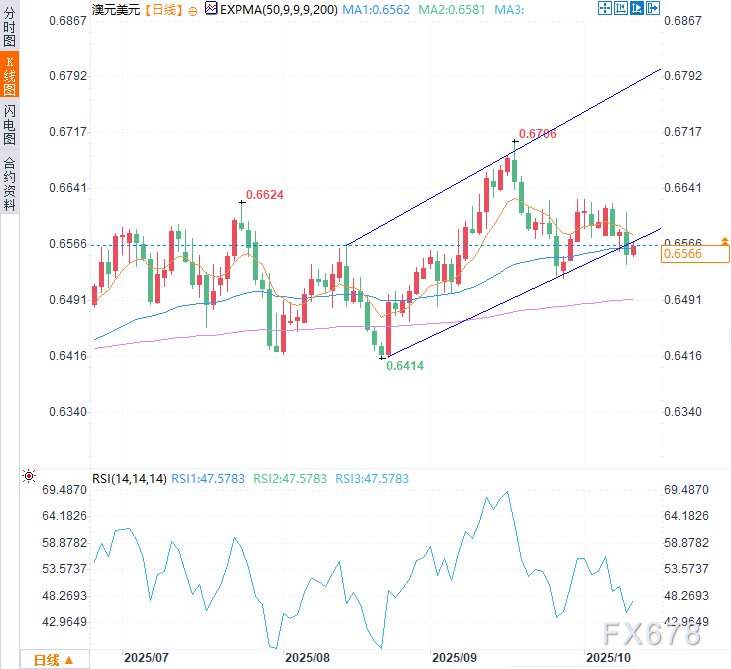 日线图技术分析显示,澳元兑美元正向上升通道方向反弹,暗示看涨动能正在复苏。然而14日相对强弱指数(RSI)仍低于50中性线,表明当前仍存在看空压力。