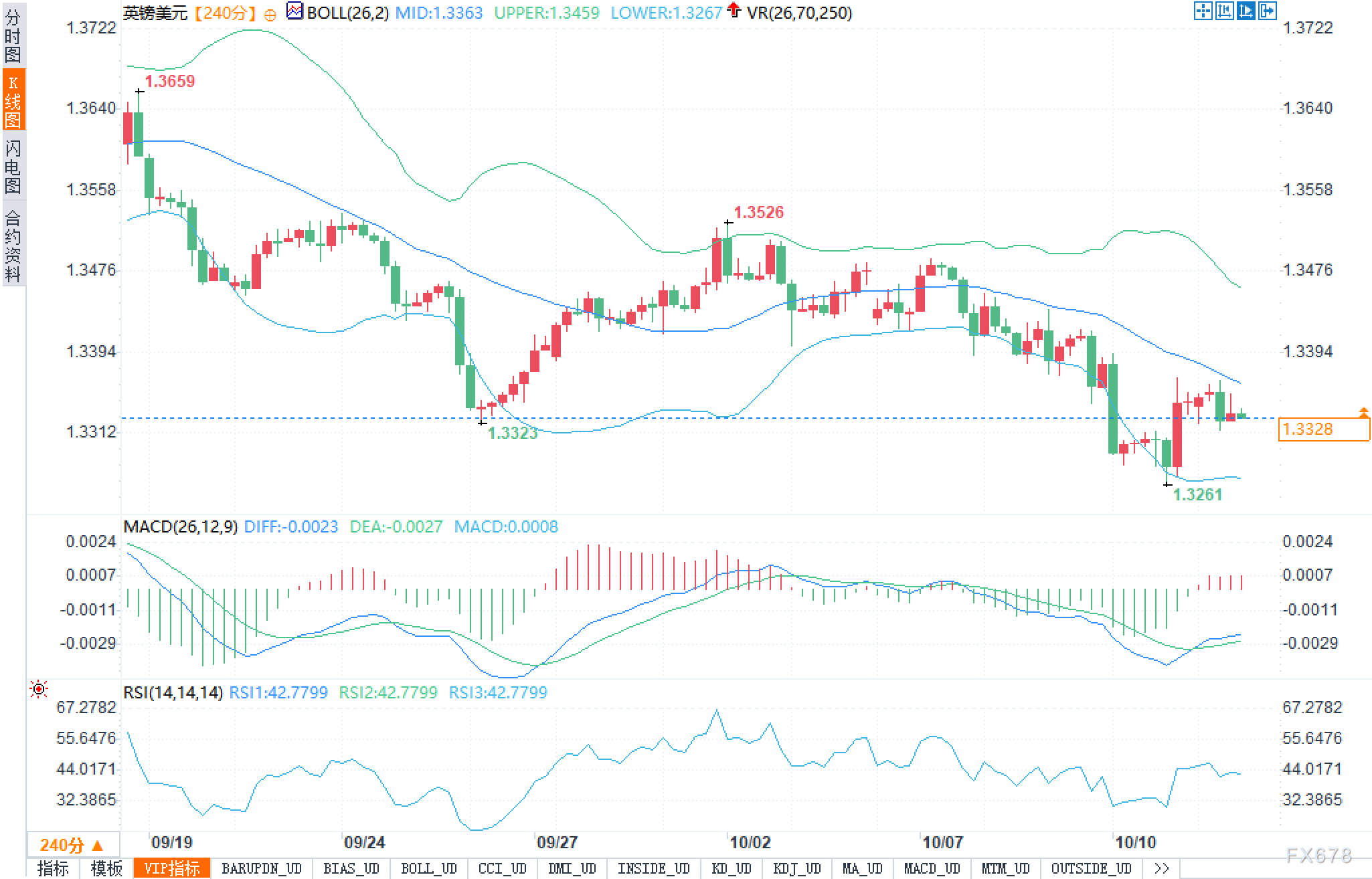 从240分钟K线图观之,英镑近期自1.3526高位回落,最低探至1.3261后震荡企稳。布林带显示:上轨1.3459,中轨1.3363,下轨1.3267,当前汇价仍压在中轨之下、偏近下轨一侧,结构定义为下降趋势中的弱势整理。历史关键点位1.3659与1.3526构成上方递降峰,下方1.3323为阶段性密集成交弱支撑,其下即是布林下轨1.3267与阶段低点1.3261的共振带。