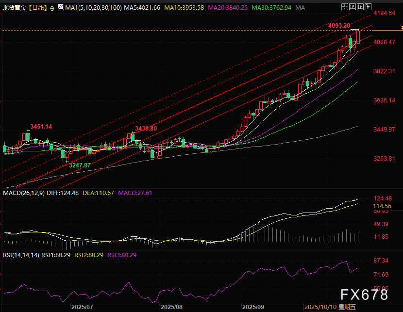 截至发稿,现货黄金交投于4081美元附近,当日涨幅近1.57%,金价在突破关键价位后持续挺进未知领域,涨势已连续第九周延续。美国总统特朗普针对中方稀土等关键物项出口管制的回应尤为激烈,他公开威胁将对中方加征100%关税,并对所有关键软件实施出口管制,该消息引发市场剧烈震动,美元指数和美股都大幅下跌。尽管周末期间浮现的谈判预期在一定程度上缓和了市场紧张情绪,但整体市场情绪仍保持谨慎。