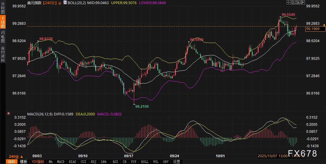 技术面进一步印证这一逻辑。布林带上轨的接近暗示指数有上破潜力,但MACD柱状线的负值提醒多头需警惕回调。若债市收益率守住4.00%关口,美元指数短期内或测试100整数位;反之,若官员讲话意外鹰派,收益率反弹将迅速压制美元动能。总体上,债市已成为美元变数的“晴雨表”:其回落提供支撑,但关门引发的经济不确定性又限制上行空间,短期拉锯料将主导盘面。