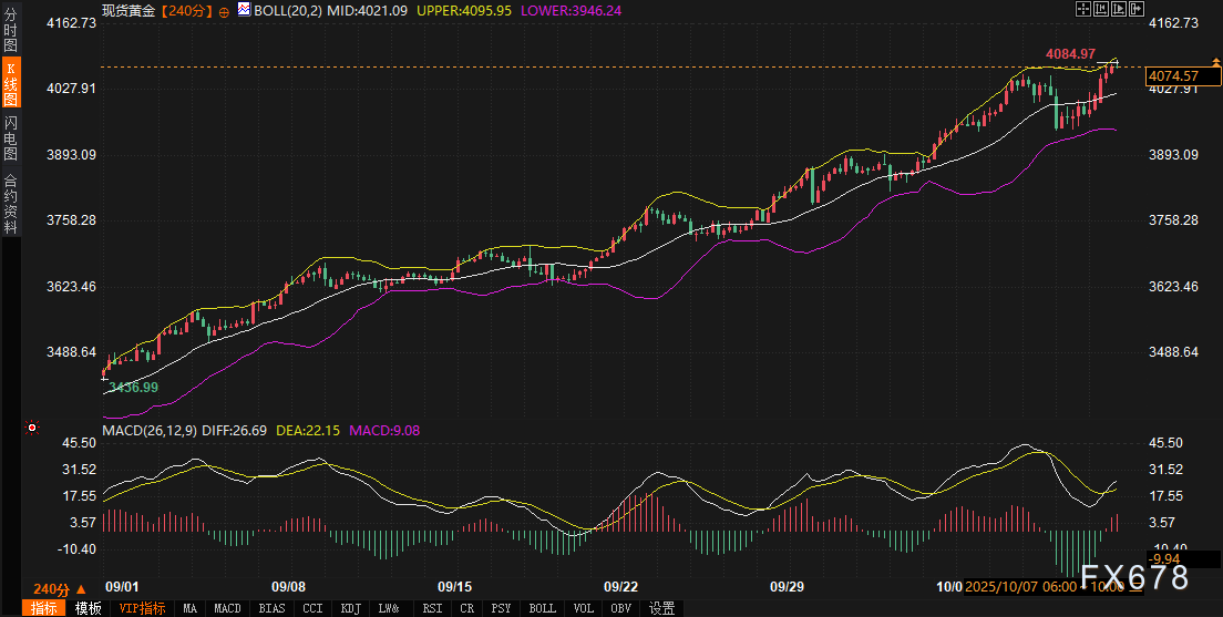 现货黄金的强劲反弹至4073.81美元/盎司,与美元同涨的表象下,债市传导的避险效应正悄然主导走势。240分钟图显示,价格已穿越布林带中轨4021.09,直指上轨4095.94,下轨3946.24则远在下方,提供坚实后盾。MACD指标DIFF 26.66高于DEA 22.14,柱状线9.02转正,确认多头动能加速,前高历史新高4084.97的突破已成定局,前低4000更像是遥远记忆。这一格局不同于常规美元-黄金负相关,而是债市收益率回落引发的资金溢出效应:投资者在关门不确定性中,将美债作为中转站,进一步推升黄金的配置需求。