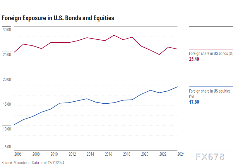 外资持仓维度,当前外国投资者持有约18万亿美元的美国股票资产(约占市场总规模的20%)及7万亿美元的美国国债(约占市场总规模的25%)。