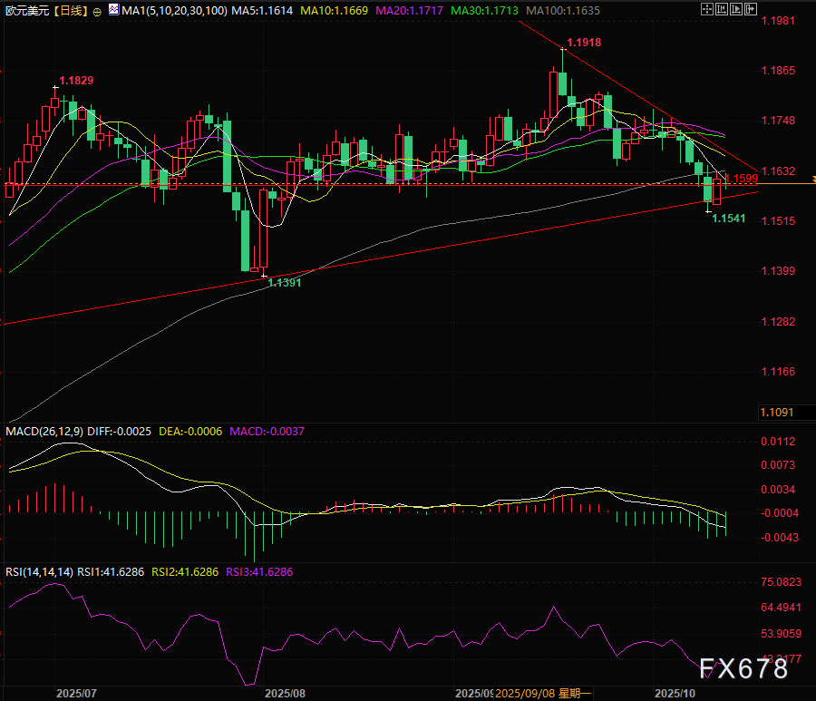 周一(10月13日)亚欧时段,欧元兑美元延续趋势小幅下跌0.14%交投于1.1603附近,受美国关税问题担忧影响上个交易日欧元一度反弹0.5%。上周前四个交易日本来美元受法国、日本政治忧虑引发的避险情绪推动,大幅走强,欧元兑美元汇率整体跌至近两个月低位附近,但上周五受美国关税问题担忧影响,美股、美元指数整体大跌,欧元借机喘息反弹。我们对上周主要影响欧元的事件做了总结。