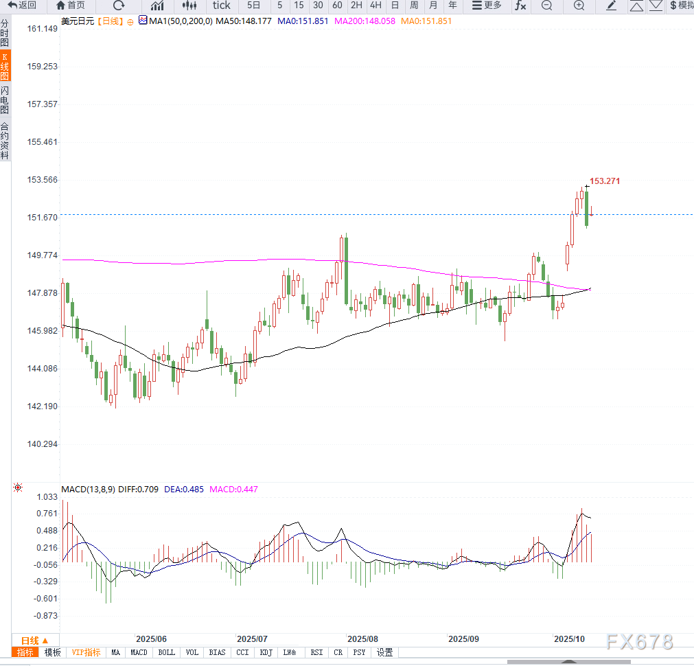 从日线级别来看,美元兑日元仍处于强势整理阶段。汇价在上周触及153.25的八个月高点后小幅回调,目前稳于5日均线与10日均线上方。