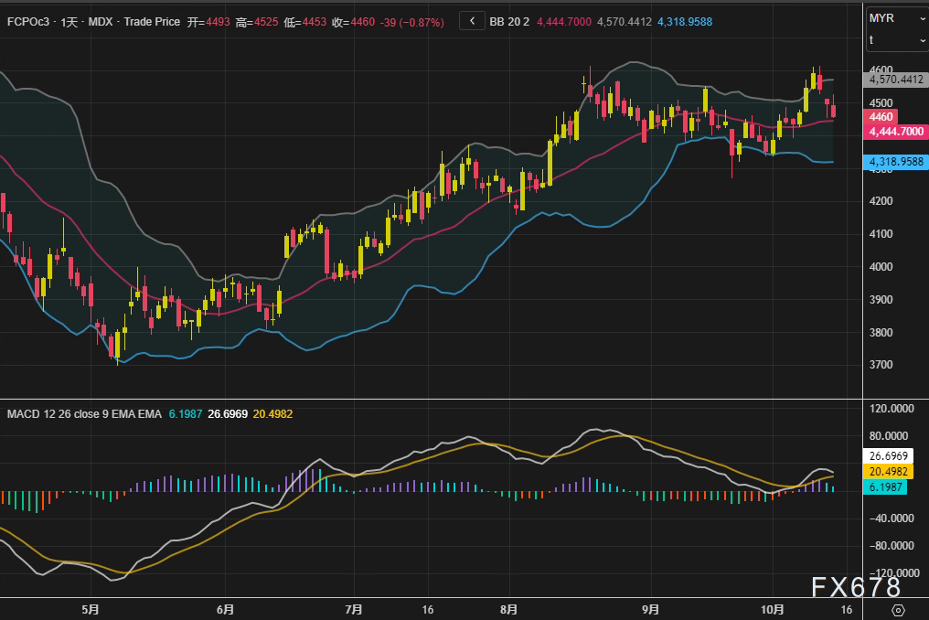 周二(10月15日),马来西亚衍生品交易所棕榈油主力合约延续跌势,截至昨日收盘,12月合约报收4460林吉特/吨,日内下跌39林吉特,跌幅0.87%,已连续三个交易日收跌。盘面技术指标显示,布林带中轨位于4570林吉特附近,短期价格承压于中轨下方,MACD双线粘合,市场动能略显疲弱。