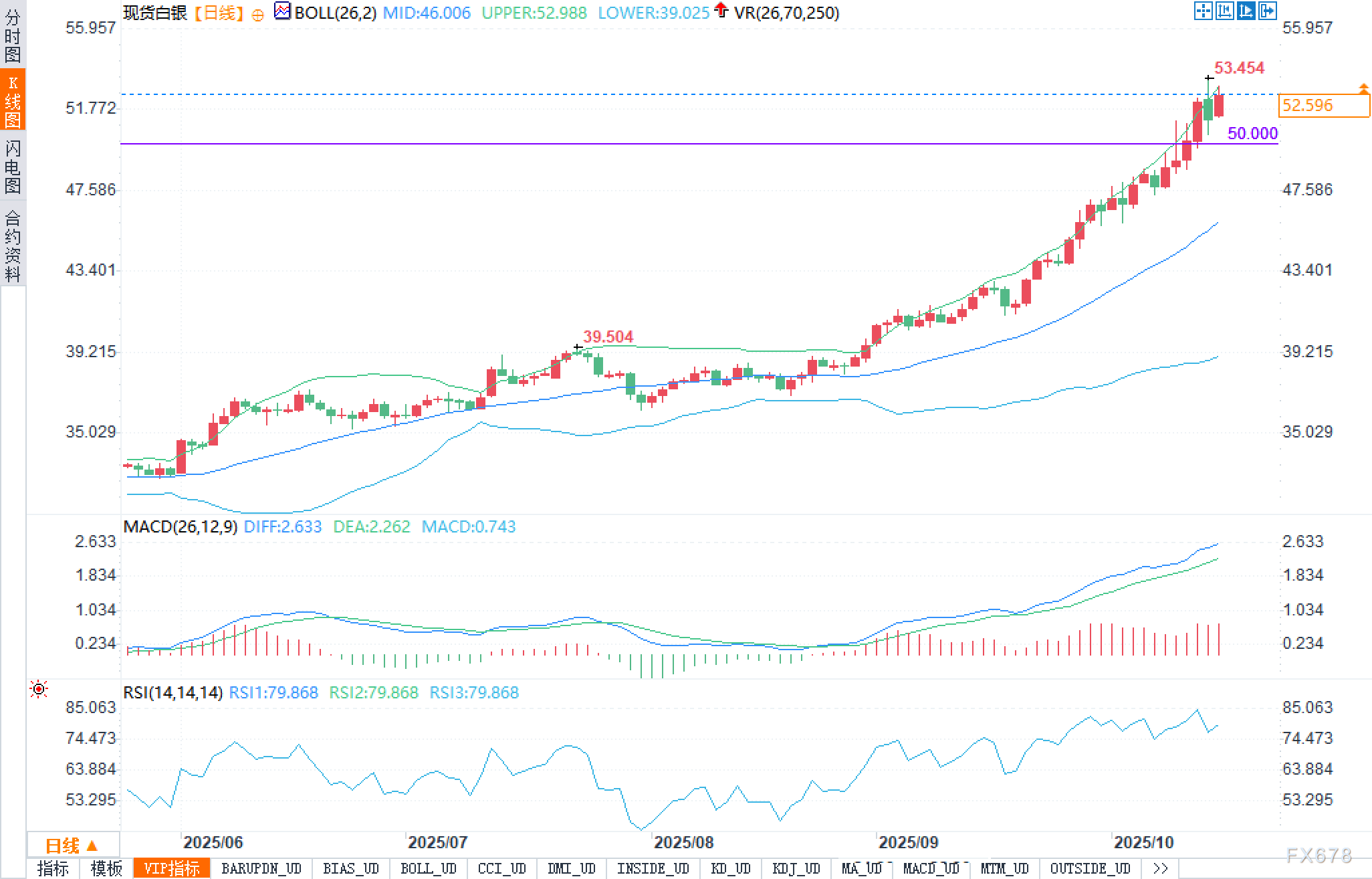 日线K线图给出一致的趋势信号。第一,布林带明显扩张,布林中轨46.006,布林上轨52.988,最新价沿上轨外沿爬升,表明上升趋势动能饱满,但短线“超涨”压力在积累。