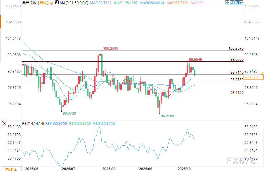除非美元能在50日均线处获得支撑并反弹,否则进一步回调至97.412的可能性依然存在。尤其是在降息预期持续巩固、风险偏好维持高位的背景下,这一回调趋势更易形成。
