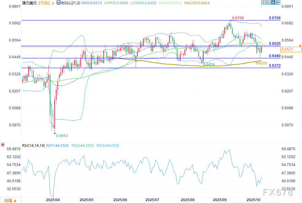 日线图显示,澳元/美元汇率在过去几周承受压力,从0.6706的高点跌至周二0.6440的低点。