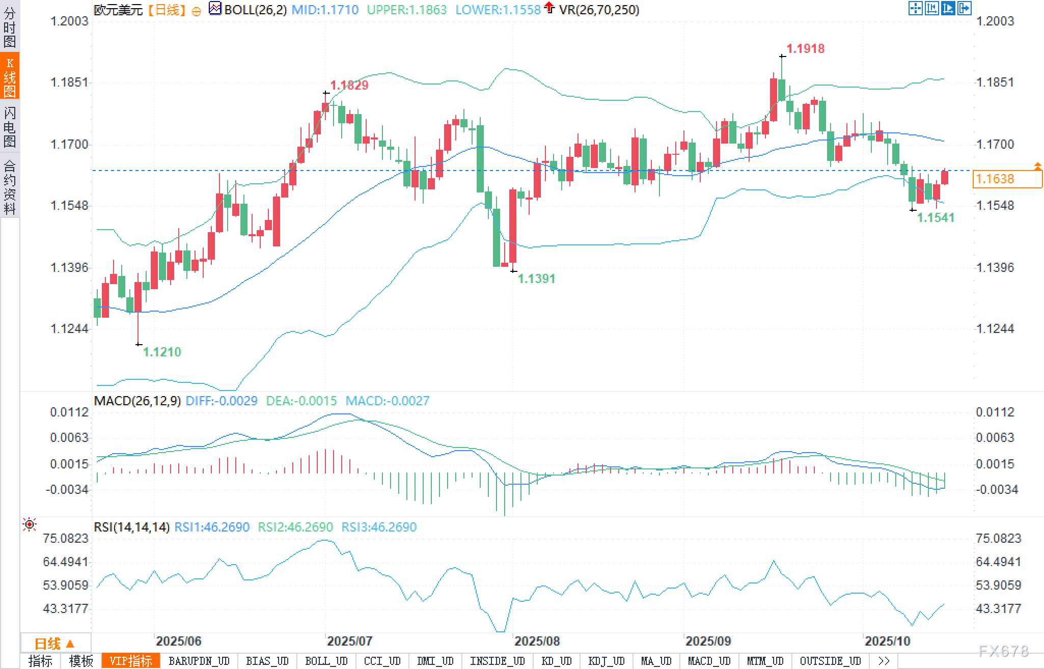 从日线图观察,布林带上轨1.1863,中轨1.1710,下轨1.1558,带宽经历前期扩张后趋于收敛,价格当前处在下轨与中轨之间的弱势反弹区。前高1.1918与1.1829构成上方级别阻力簇,前低1.1541与1.1391构成多重静态支撑。MACD(26,12,9)DIFF -0.0029、DEA -0.0015、柱状图 -0.0027,整体仍在零轴下方但绿柱缩短,提示空头动能衰减、存在“零轴下方金叉”预期;RSI(14)约46.269,处于中性偏弱,尚未进入超买/超卖,契合震荡偏修复的市况。