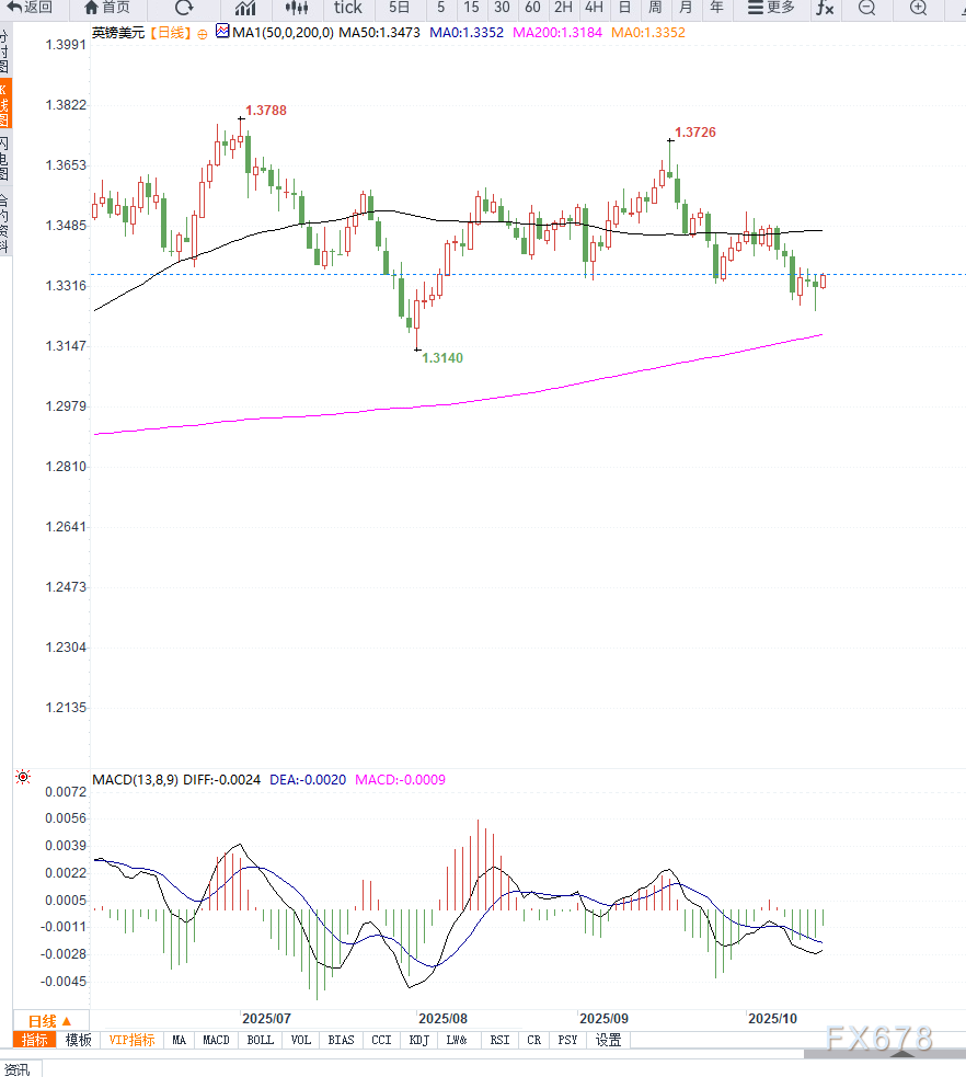 从日线图来看,英镑兑美元在连续两天下跌后出现技术性反弹,目前汇价仍位于20日均线(约1.3370)下方,显示上方压力依然存在。