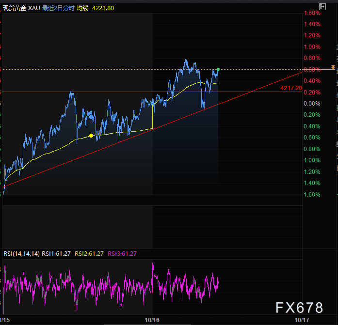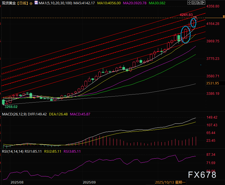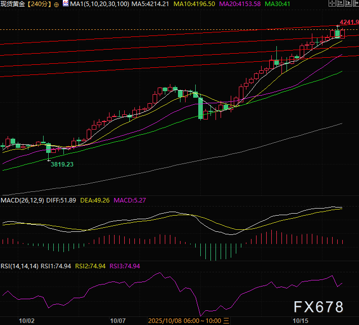 现货黄金自周四(10月16日)亚洲时段触及的历史新高4241后快速回落约0.7%,但在利好的消息支撑下又反弹回起跌位置,目前涨0.58%交投于4232附近,仍连续第五个交易日维持看涨基调。