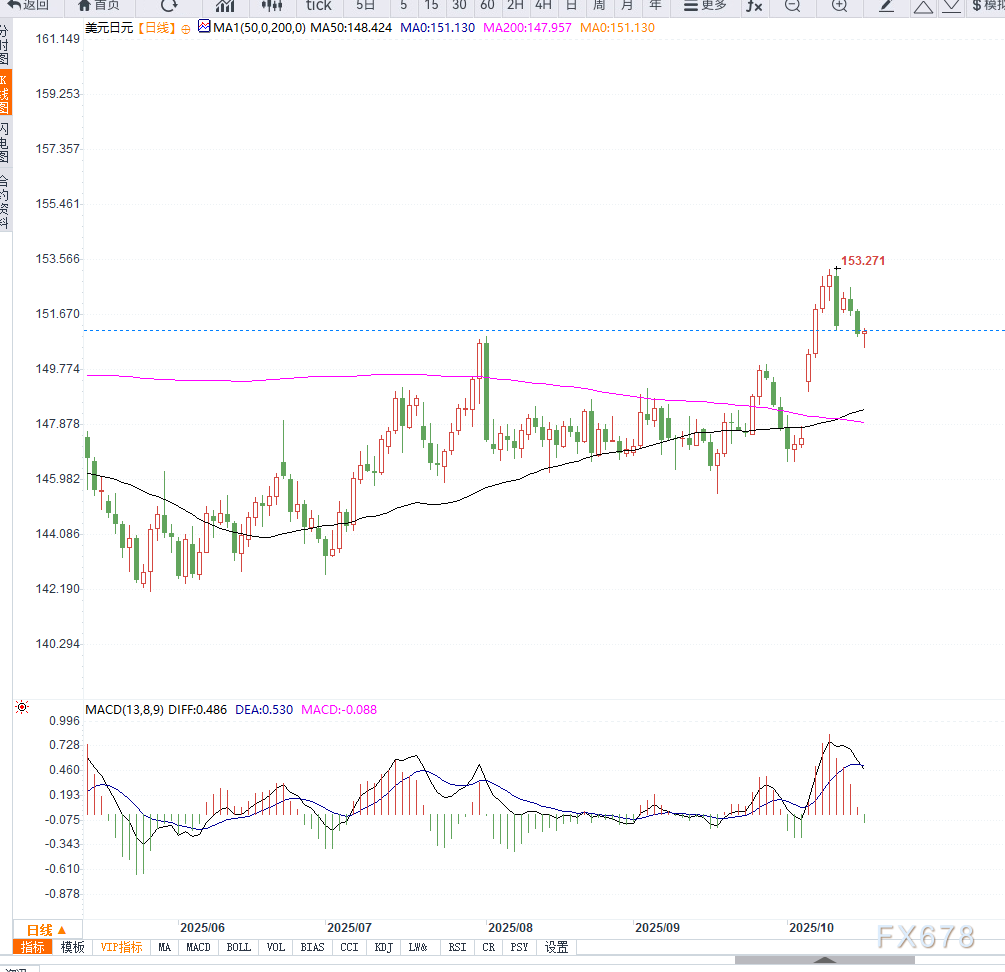 反之,若反弹,初步阻力位位于151.00关口,若能企稳其上,汇价可能进一步上攻至152.00~152.60区间。然而,目前技术指标仍显示短线偏弱,若无基本面利好推动,反弹空间或有限。