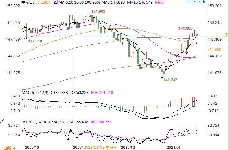 周五(1月19日),美元指数在连续五个交易日上涨后稍有停顿,当日出现微跌。但全周来说,由于近期的经济数据表现强劲和美联储官员的鹰派言论抑制了快速降息的预期,美元指数一周表现还是录得不错的上升幅度。美元兑日元上周五持平于148.15水平。日本央行定于周一和周二召开政策会议,早些时候的数据显示,日本核心通胀率在截至12月的一年里放缓至2.3%,创下2022年6月以来的最低增长年率,这减轻了决策者迅速采取行动的压力,市场预期其可能会维持超宽松的货币政策不变。利率差上的劣势,恐将继续推动日元偏于弱势的走势格局。本周重点留意日本央行利率会议揭晓结果所带来的影响。从日线图上观察,美元/日元保持继续上行的态势未有改变迹象,技术指标均还处于明显上摆之中,显示美元多头力量仍占优。但短线需防范获利调整而出现小幅回落的风险。
