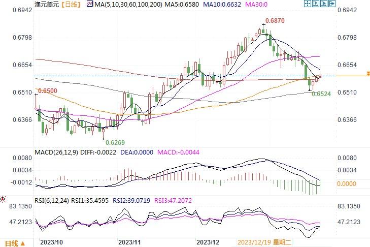 周五(1月19日),澳元兑美元上涨0.2%至0.6587美元,从上一交易日0.6525美元附近的支撑位有所反弹,但全周迄今仍下跌1.5%。澳洲联邦银行澳洲经济研究主管Gareth Aird说:“我们认为,澳洲央行今年将需要降息,以防失业率远高于4.5%,但我们的基本判断是宽松周期将从9月开始。”目前预计澳洲央行要到今年年底才会放宽政策,而不是年中。6月降息的可能性降至38%,8月行动的可能性为60%,9月为87%。但是,由于美国经济数据表现良好,且美联储官员极力打消提早降息的市场预期,美元指数保持反弹回升势头较猛。在美元强势压制下,澳元的表现也是节节后撤。日线图上,动量指标好坏参半,5、10和21日移动均线下滑,波林带通道区间下降,信号显示较强的偏空格局。首道重要支撑位在10-12月升势的61.8%回档位0.6500。只有收盘于下降的10日移动均线0.6632上方,方有望结束下行趋势。