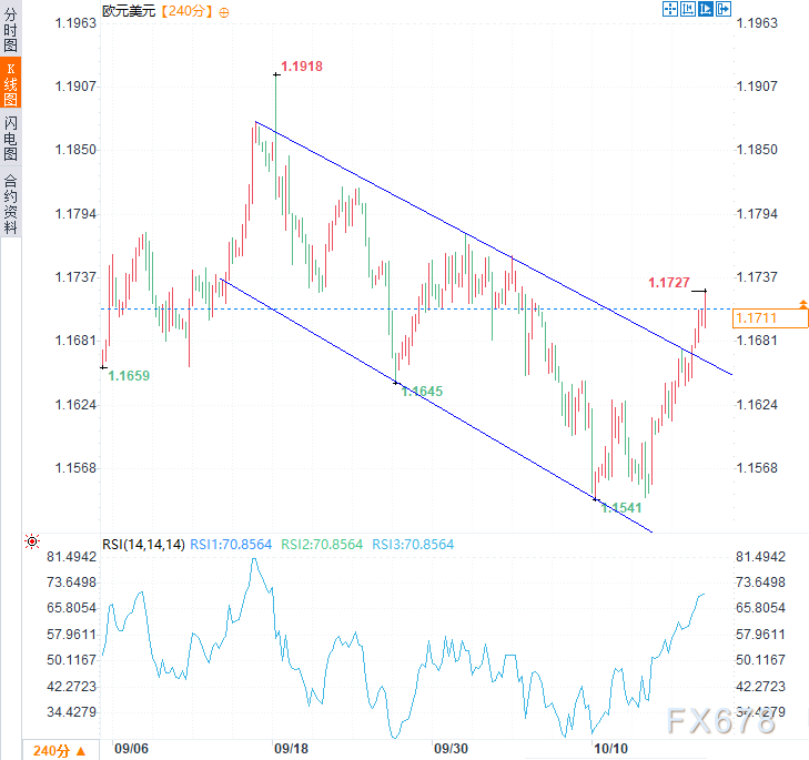 欧元/美元连续第四日走强,有望创下七月中旬以来最佳单周表现。当前价格走势即将触及双底形态目标位1.1730,而4小时图相对强弱指数(RSI)进入超买区域,表明汇价可能迎来技术性整理甚至部分获利了结。