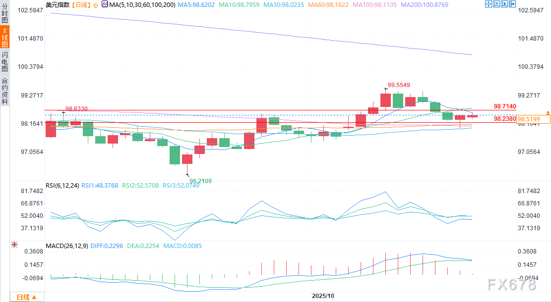 周一(10月20日)美盘时段,美元指数(DXY)小幅走低,测试98.238至98.714之间的关键技术区间。价格走势始终局限在这一回调区间内,交易员同时权衡日本和欧洲的政治动态、中美贸易关系企稳的信号,以及债券市场的谨慎情绪。