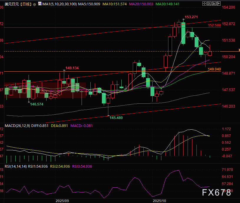 美元兑日元守住上升通道中轨,MACD,RSI继续维持看涨,第一压力位为150.91,之后是上方头部形态的152.58,涨过此价位美元兑日元的头部风险将被破解。