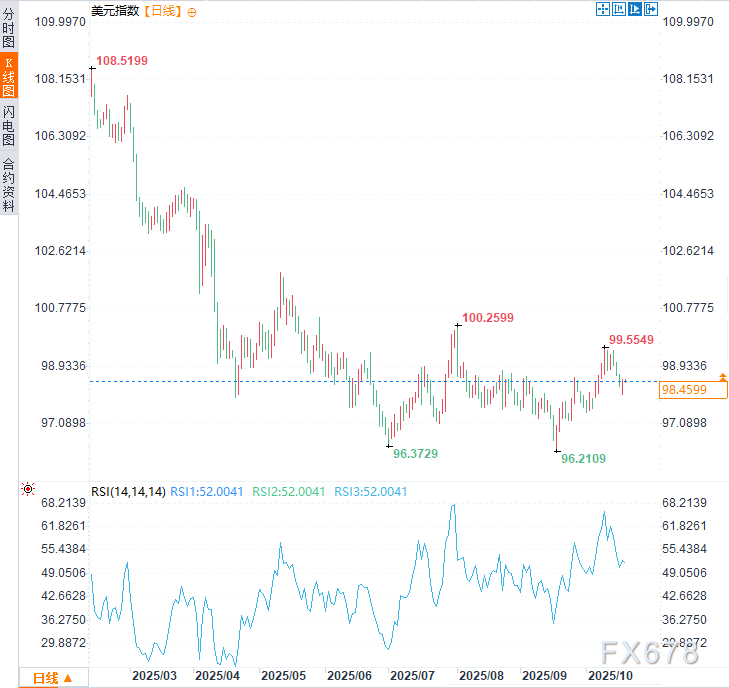 周一(10月20日)美元指数于98.45附近窄幅震荡,近六周来美元指数始终位于100关口下方低位震荡。