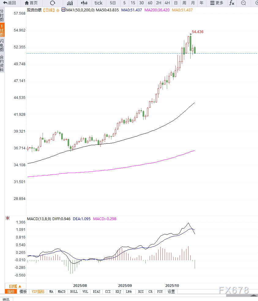 白银短线承压主要受贸易缓和和美元回升影响,但技术面仍显示多头格局未变。可关注 51.50–49.34 区间支撑是否有效,上方阻力关注 54.50 历史高点,突破将延续近期上涨趋势。