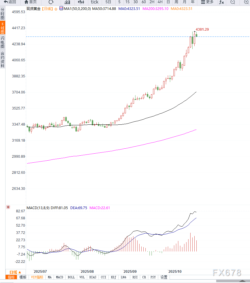 黄金在亚洲盘延续日内回调,从历史高点附近回落至约4320美元附近。美元连续三天吸引买盘,在日内形成一定压力,促使黄金多头获利了结。