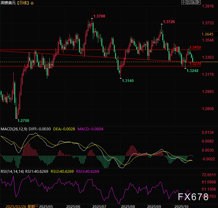 周三(10月22日)欧洲交易时段,英镑兑美元下探至1.3310一线,盘中汇价一度快速下跌60个点,跌0.37%,目前交投于1.3319附近。该货币对已连续第四个交易日呈现下行走势。英国通胀数据公布后,英镑短线快速走低,数据印证当前物价压力已触及阶段性顶部。