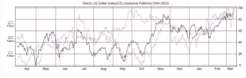 3月份的美元指数期货合约呈现出一个季节性的15年(黑线)底部形态,通常在12月或1月触底,并在2月持平,过去曾发生过重大涨势。