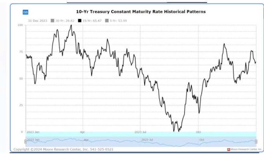 2023年12月份住房开工下降了4.3%,最终拖累了家居和家具购买,导致对这些产品的需求减少。12月份的PPI达到-0.01,而共识预期为0.1%。另一个可能影响利率的因素是即将到来的2024年总统选举。尽管美联储声称在政治上独立,但在选举年,经济和利率可能会受到影响。