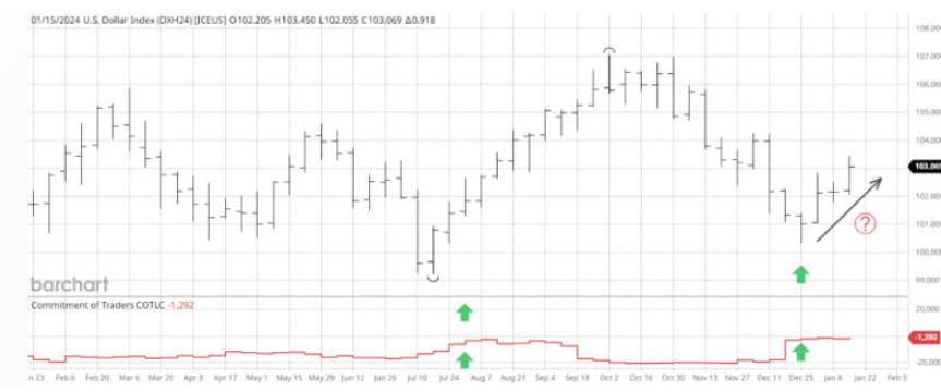 每周连续美元指数图表和COT报告显示,美元指数市场的商业交易者(红线)在过去52周中比以往任何时候都更加看好。上一次商业交易者对美元指数如此看好是在2023年7月,导致价格上涨了8%(绿箭头)。另一个积极因素是最近的积累发生在比7月份更高的价格水平。