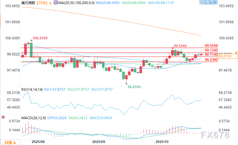 上行路径打开了测试10月9日波动高点99.563的可能性。交易员正等待催化剂(可能是周五的CPI数据)来确认多头延续趋势。若CPI数据符合或高于预期,可能会推动美元指数向这一技术目标进一步上行。