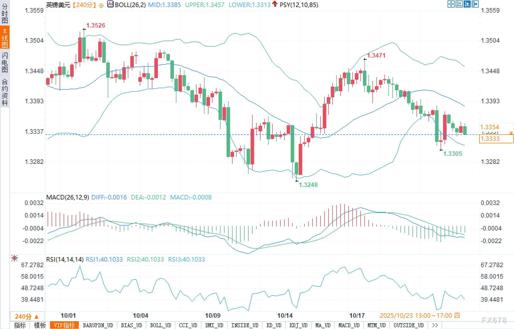240分钟K线清晰显示英镑处于布林带下半区间徘徊,当前价贴近布林下轨之上。指标参数显示布林中轨约1.3385、上轨约1.3457、下轨约1.3313。价位结构上,前高1.3526→回落→次高1.3471→再度回撤至1.3305并反抽,形成一个“低点抬升未成形、高点已下降”的短线收敛态势。现价对下轨1.3313的反复试探,给出“弱势均值回归”的典型图景:反弹多以触及中轨1.3385告终,难以延伸至上轨1.3457。