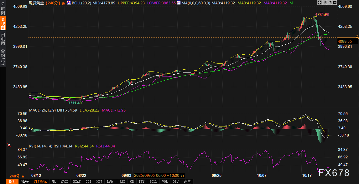 从技术面来看,黄金240分钟图显示,价格在布林带中轨下方企稳反弹。当前布林带三轨分别位于4184.77、4399.99及3969.55,显示短线波动区间依旧较宽。金价在中轨下方震荡,短线反弹动力增强,但上方4200—4180区间仍有技术性阻力。